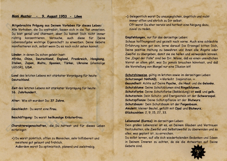 Wenn Sie dieses faszinierende und spannende Thema interessiert und Sie mehr über sich erfahren möchten, füllen Sie gern den rückseitigen Bestellschein aus und geben ihn bei mir persönlich ab oder senden ihn mir mit dem entsprechenden Betrag an die unten angegebene Adresse zu. In Form einer hübschen Schmuck-Urkunde (auch eine schöne Geschenkidee!) erhalten Sie dann in wenigen Tagen von mir Ihre persönlichen Lebensdaten.